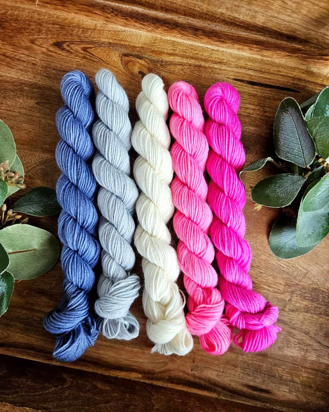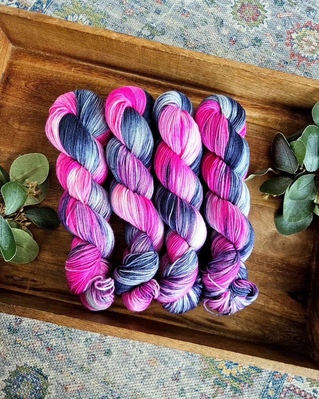 For those who love coordinating their project bag with their knitting or crochet, I’ve got you covered. I dyed up a vividly variegated yarn on my standard fingering‑weight base, a durable blend of 70% Superwash Merino wool and 30% nylon that’s perfect for socks. Hat and mitt makers will be happy to know this colorway is also available on my ultra‑soft Superwash worsted‑weight base, and it feels as good as it looks. I’ve even added a few fingering‑weight mini sets to the mix.