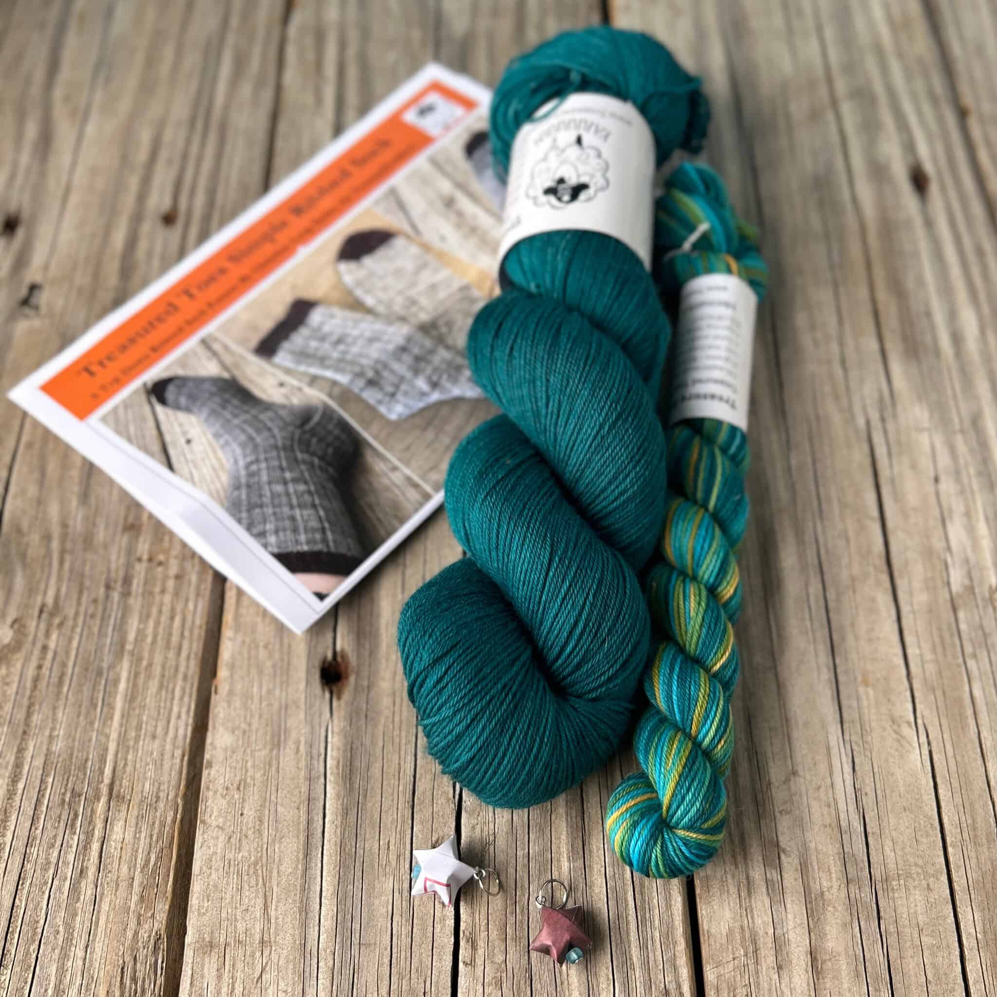 Ahoy, me hearties! Treasure Goddess Yarn has new fun sock-knitting kits. A favorite of mine features Sea Monster (rich deep teal) with mini skein of Mermaids & Moonshine (turquoise, greens and golds) for pops of fun color at your toes and cuff edges. Each kit comes with an easy sock pattern, full-sized skein of sock yarn and 20-gram mini skein of luxury Treasured Toes Sock Yarn, plus cute stitch markers. All you need are your needles! Will you choose Sea Monster? Or Ghost Ship with Ruby Daggers? Or Pieces of Eight with Song of the Sirens? Every choice is super yummy!