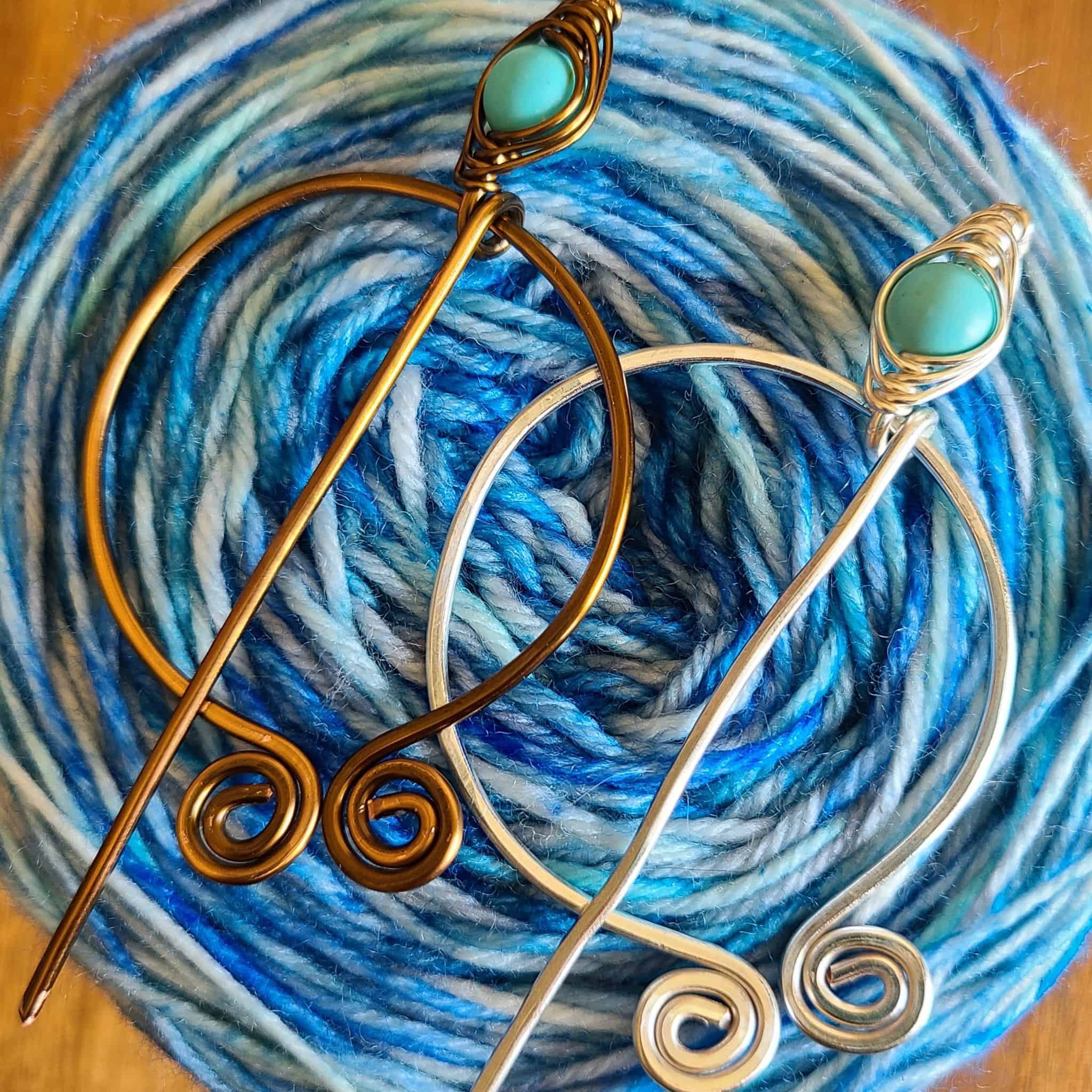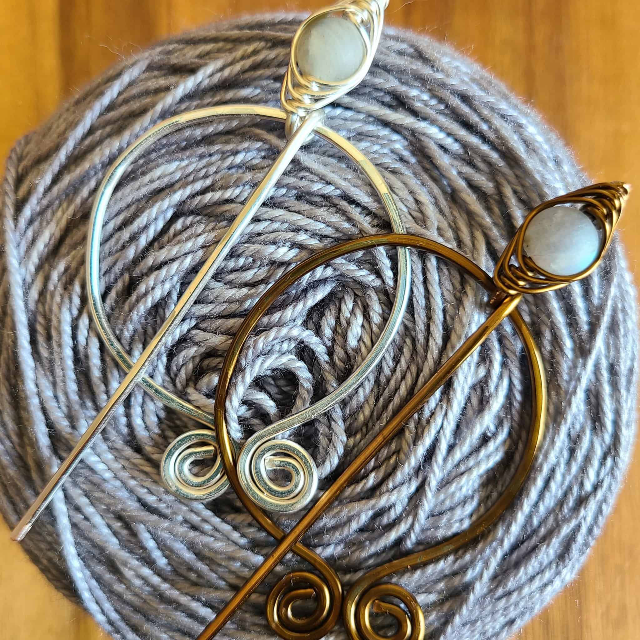 Our Penannular Pins combine graceful curves and treasured gems for a fanciful finishing touch. They are perfect for drawing attention to your handmade shawls, cowls, cardigans, scarves, hats, and more whether you’re a knitter, crocheter, or weaver. This functional design has been around since the Iron Age. Vikings, Romans, Celts, Scots, and Irish all wore them! Take a journey through history and add timeless fashion to your handmade wardrobe with a Penannular shawl pin.