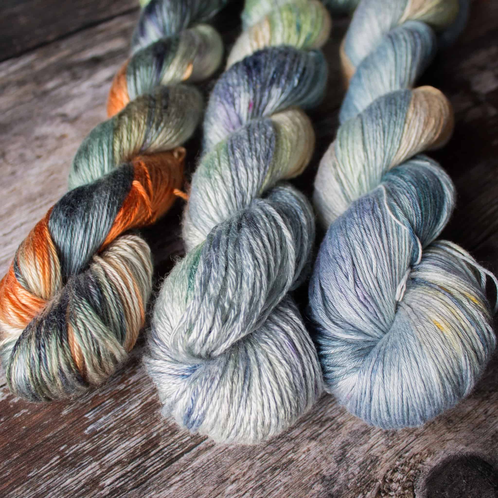 Featured first is our Scary Season Socktober set, which will be a small batch. I wanted to convey mossy tombstones and rusty hand railings — so amidst the gray and dark dominant colors, we have mossy green and rusty oranges. We have two Librarian Sock with Minis, one Companion 4-ply with Lib Sock Mini, and two Hardy DK.