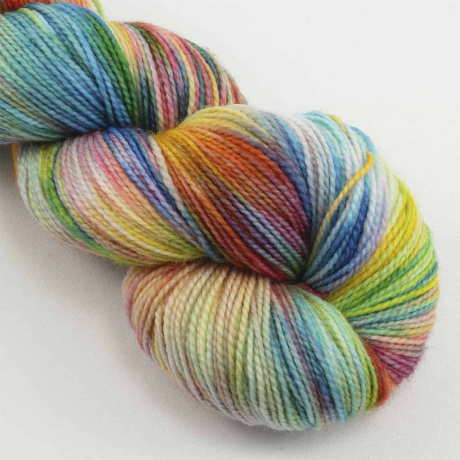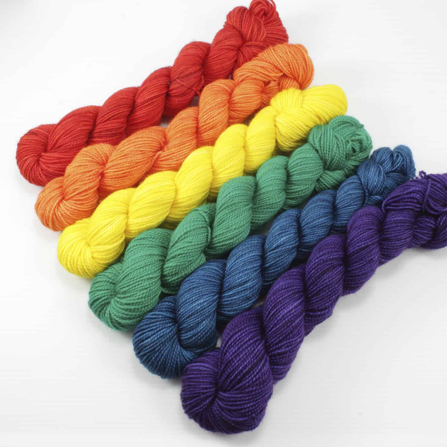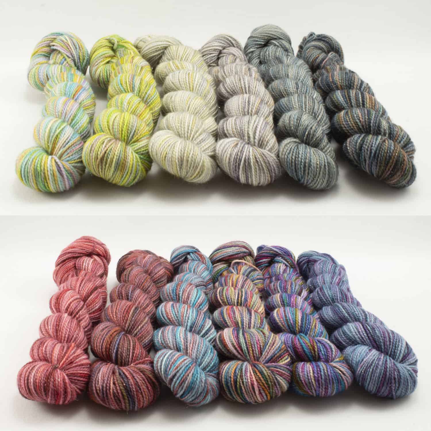 I focus on dyeing variegated and coordinating semisolid colorways on yarns and spinning/felting fibers. I especially love colorwork and fade sets, and I’m always coming up with new rainbows — brights, neons, dark, moody — I can’t get enough rainbows!
