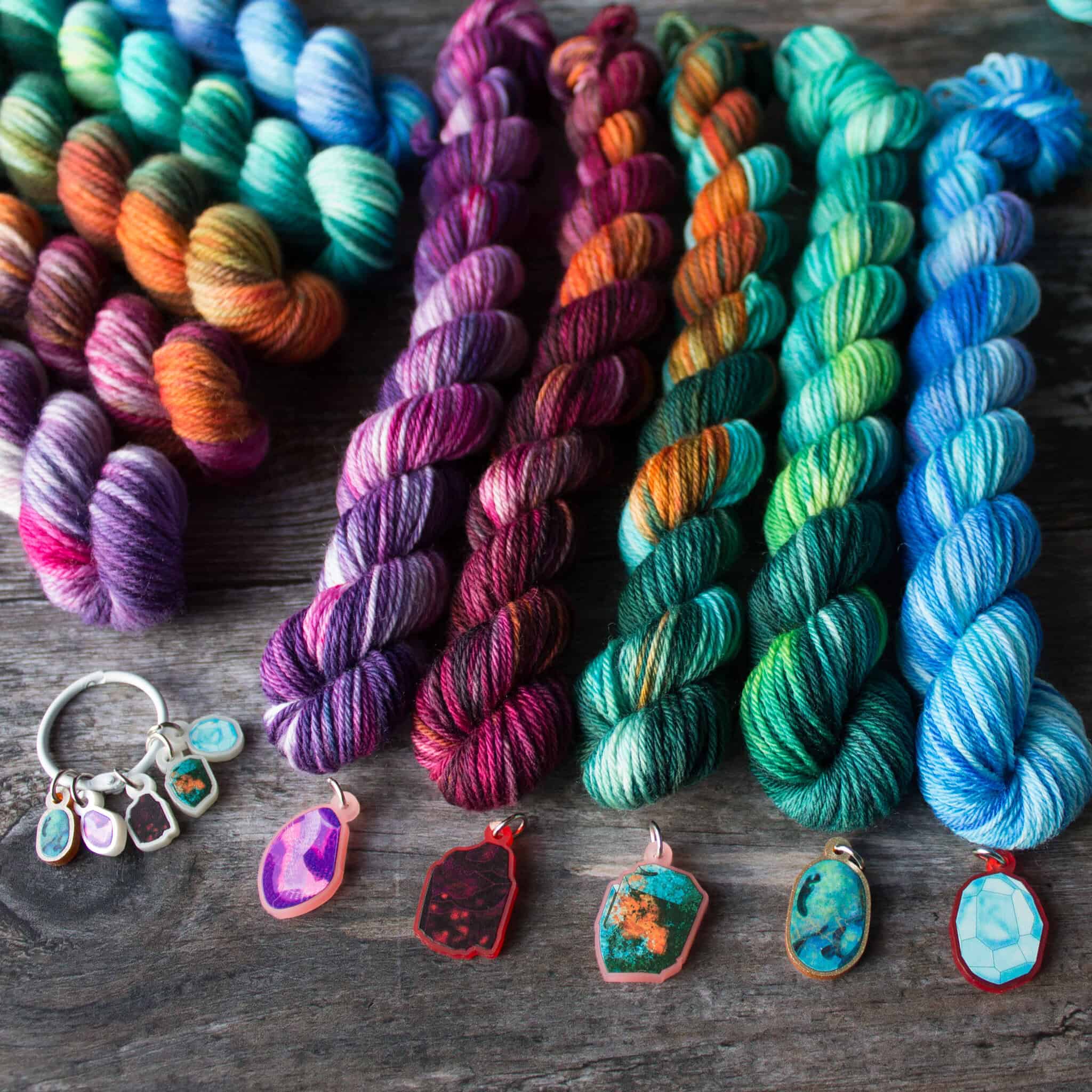 We’ve just released a new set of polyhedral dice stitchmarkers, perfect for dice goblins like ourselves — new dice without adding to your dice collection. This way you get to add dice to your projects instead. Along with this new release we’ve dyed up a few mini and 50g sets in a colourway inspired by the dice design, along with some other sets to go along with our stitch marker designs.