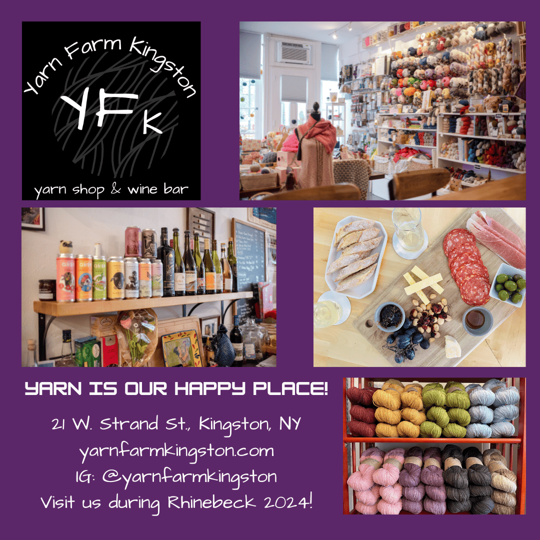 At Yarn Farm, we sell a thoughtfully curated selection of beautiful, high-quality materials and products for fiber artists with an emphasis on small-batch or locally-produced yarn, fiber, fabric and accessories. We offer delectable wines and local craft beer paired with simple fare. Everything we offer we love, and we offer with love. We provide the resources and space for you to learn a new craft, deepen a skill and feed your creativity on your own or with support. We promote inspiration and inclusivity at our shop on the Kingston waterfront, just across the river from Rhinebeck. Take a class, come to an event, feed your soul and shop local. Not local? See you at NY Sheep and Wool 2024! Or get in touch, we are always happy to ship!