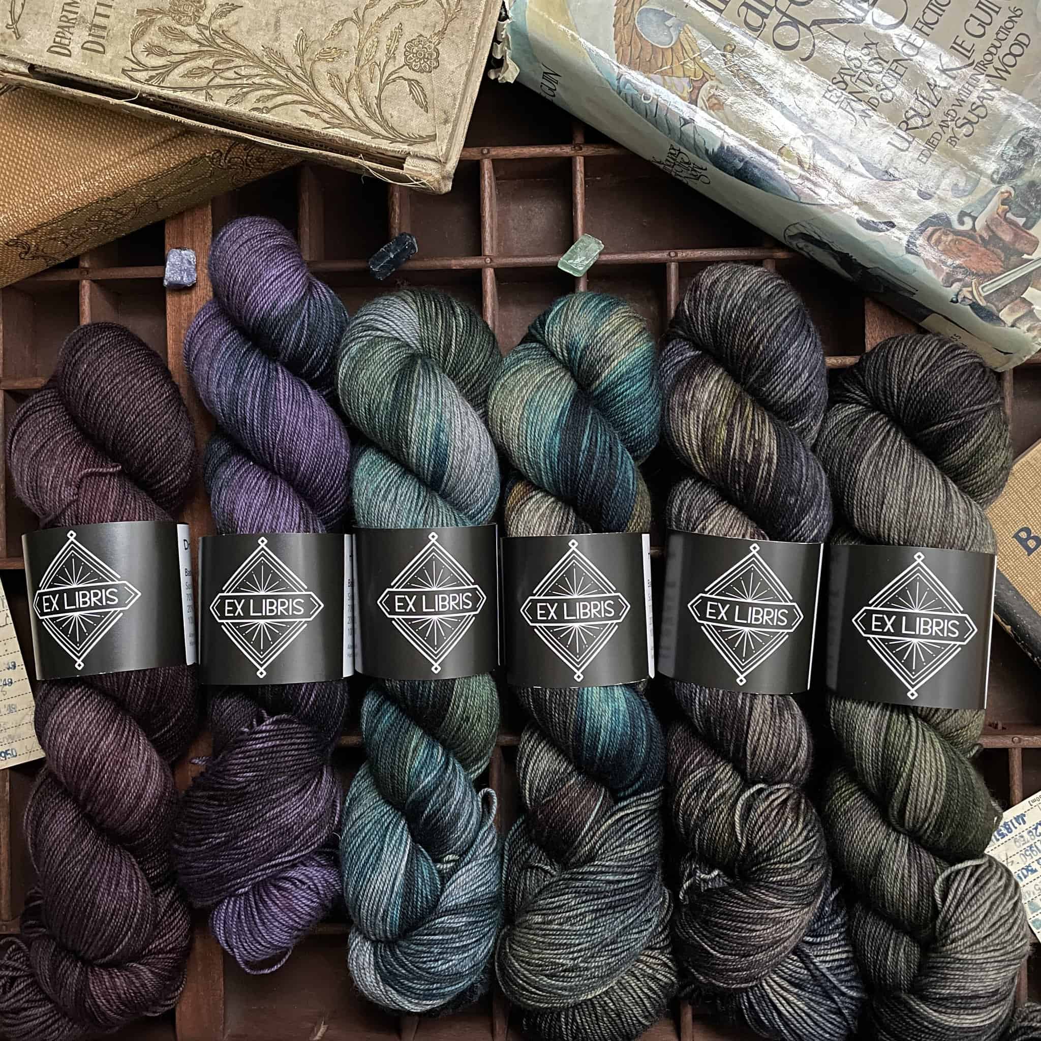 If you could use a little light appearing from the deepest, darkest bog, Ex Libris Fibers’ limited color Buried Moon color is available on Superwash sock, Merino DK and U.S. worsted bases. A mini skein set in superwash sock combines the five dominant colors from the variegated version for a stunning palette.