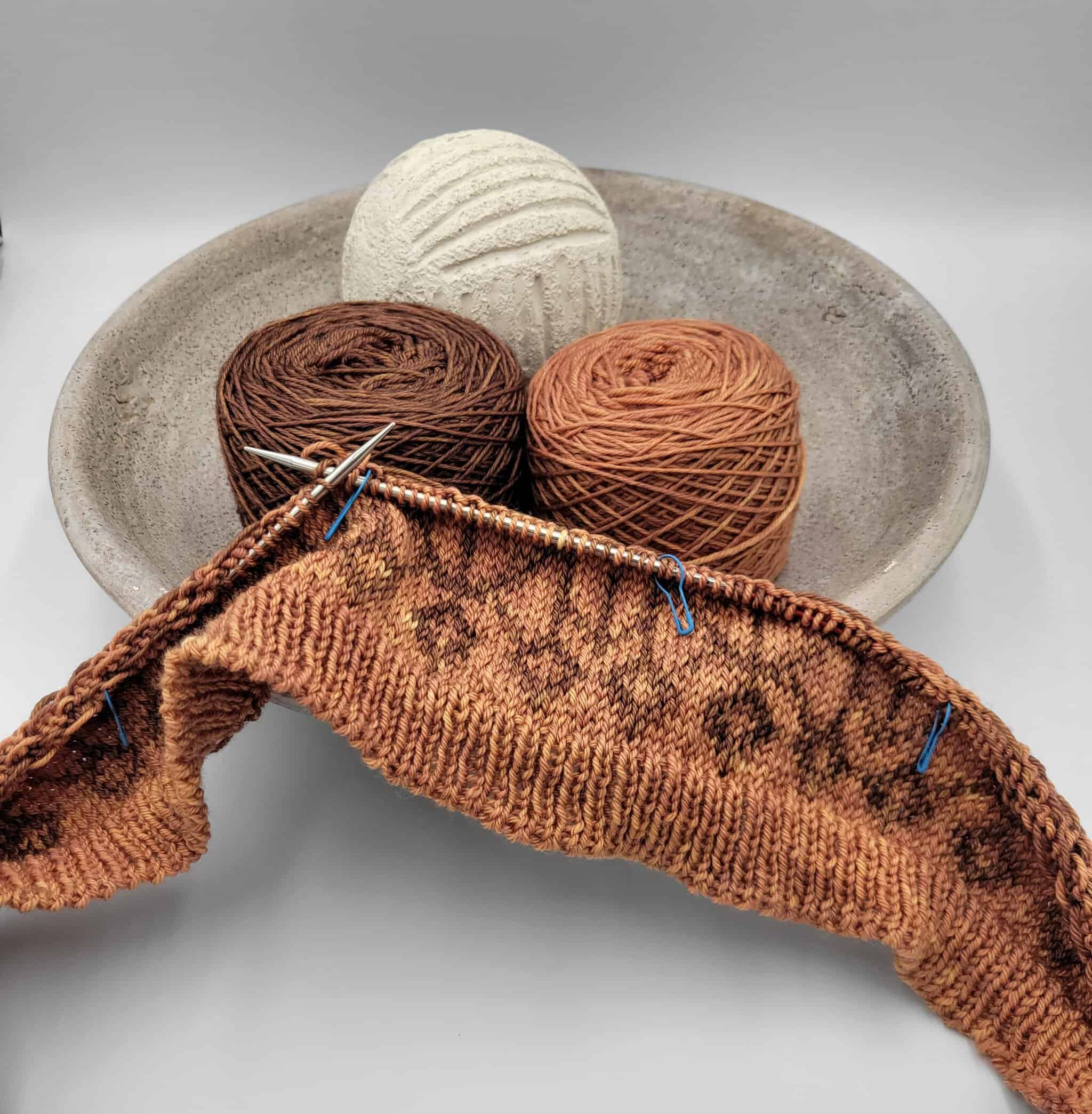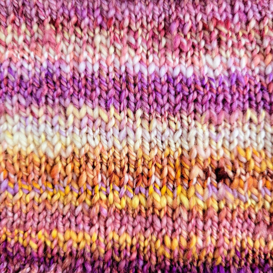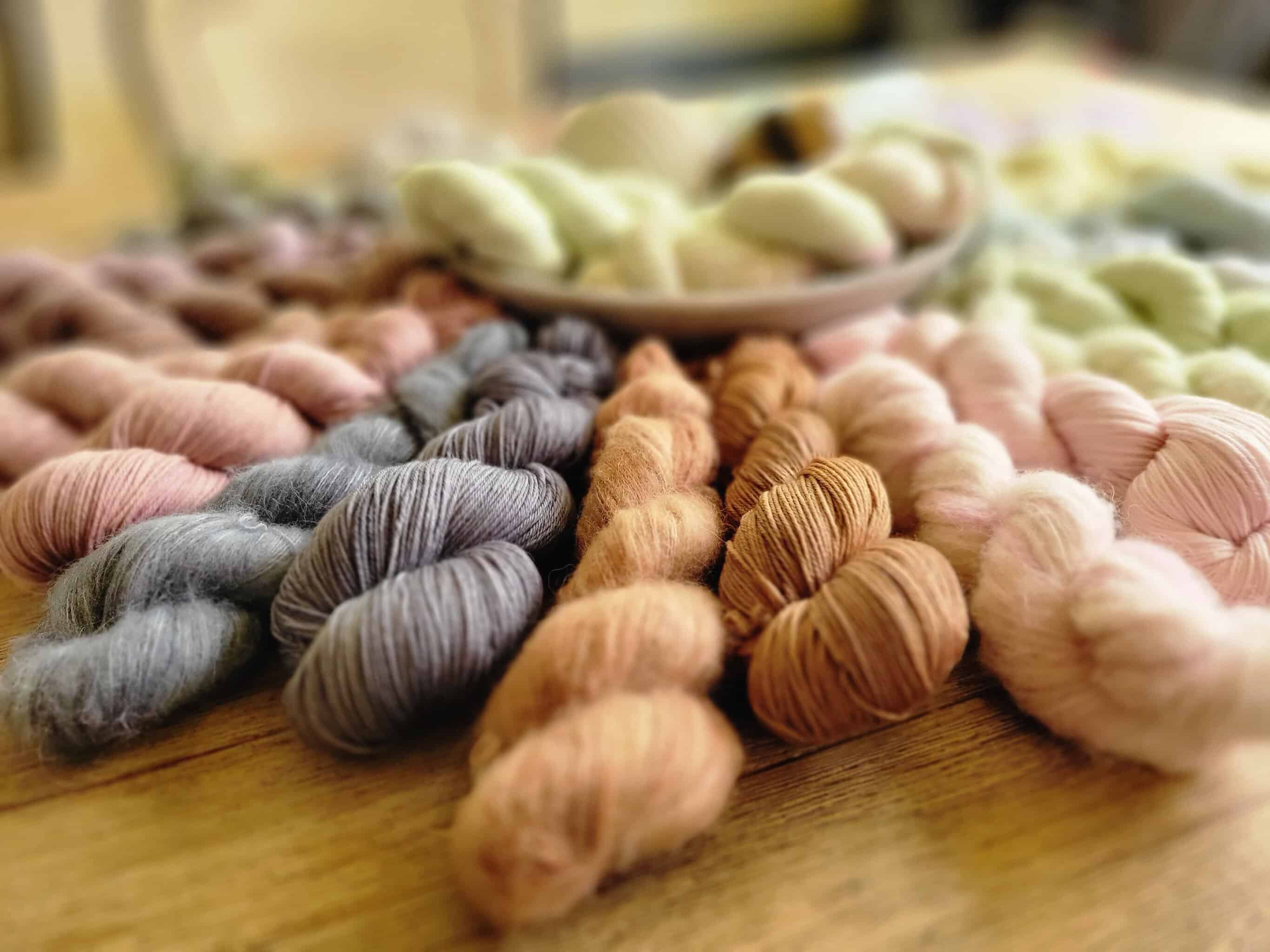 Cardinal is a deep red speckled tonal. Birch is colour corrected to a white background, speckled, and resist dyed to produce those unmistakable black “lenticels.” And Snow Blue Sky is an unrealistic childlike blue sky with white snow spots. The spots are random but regular and produce reverse speckling throughout the entire skein.