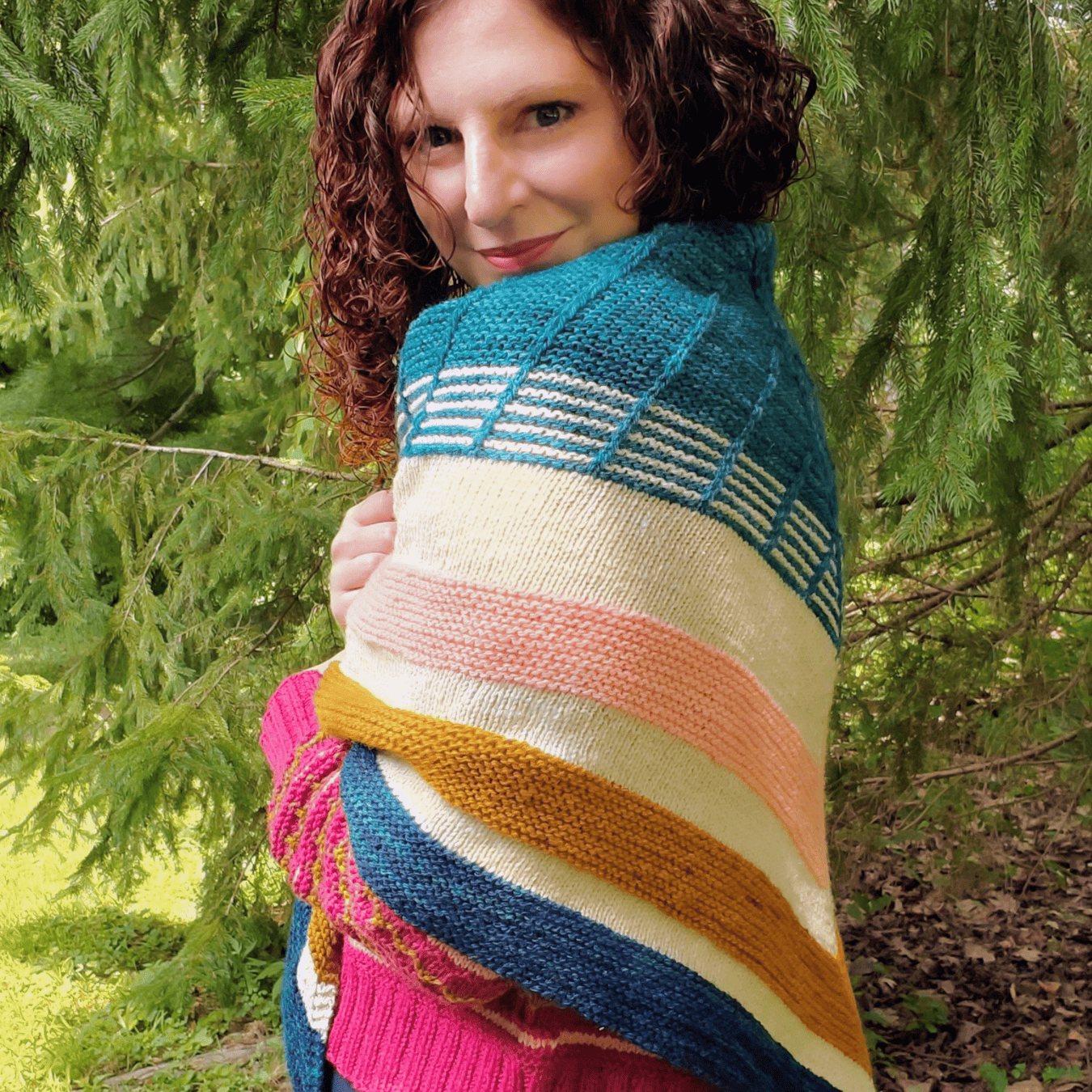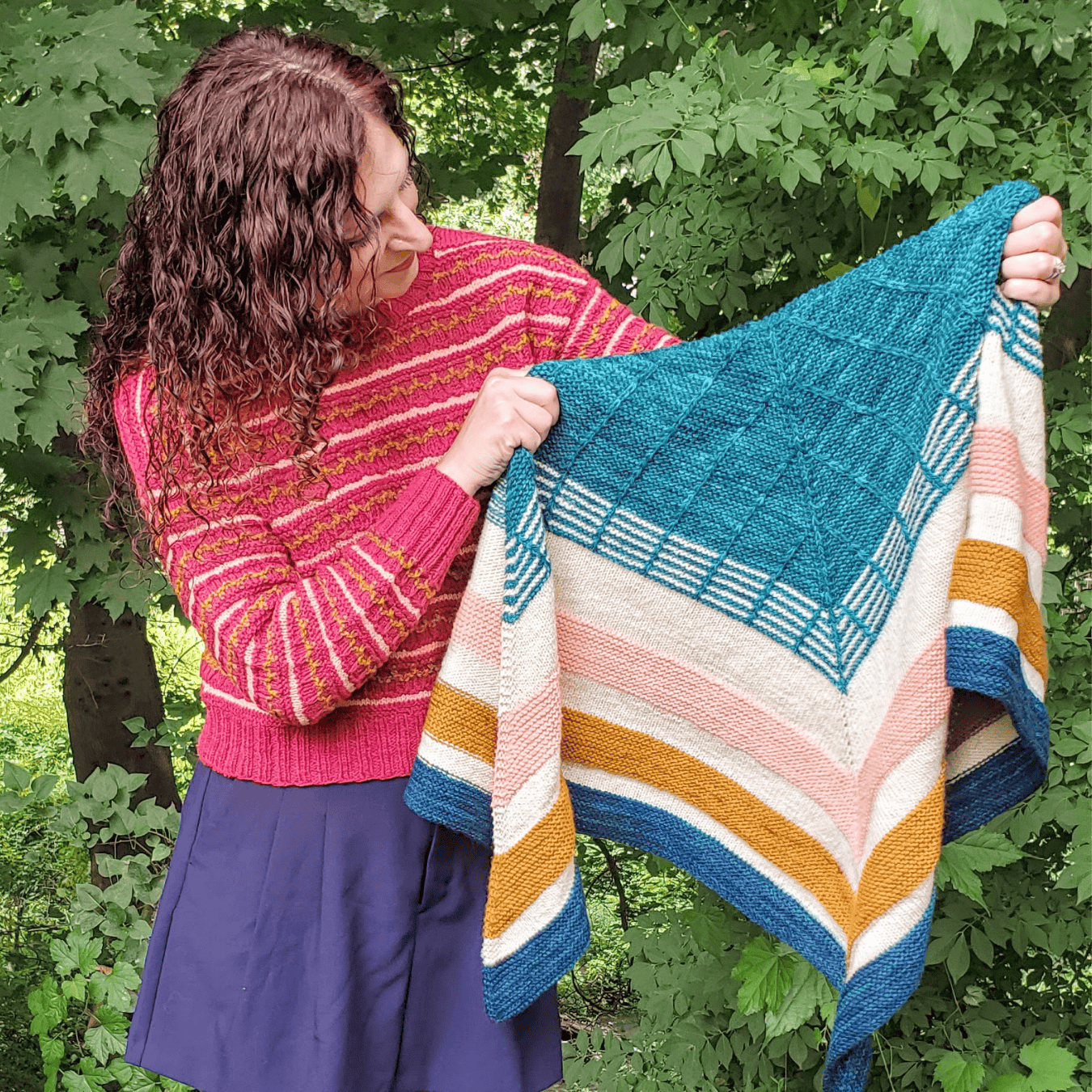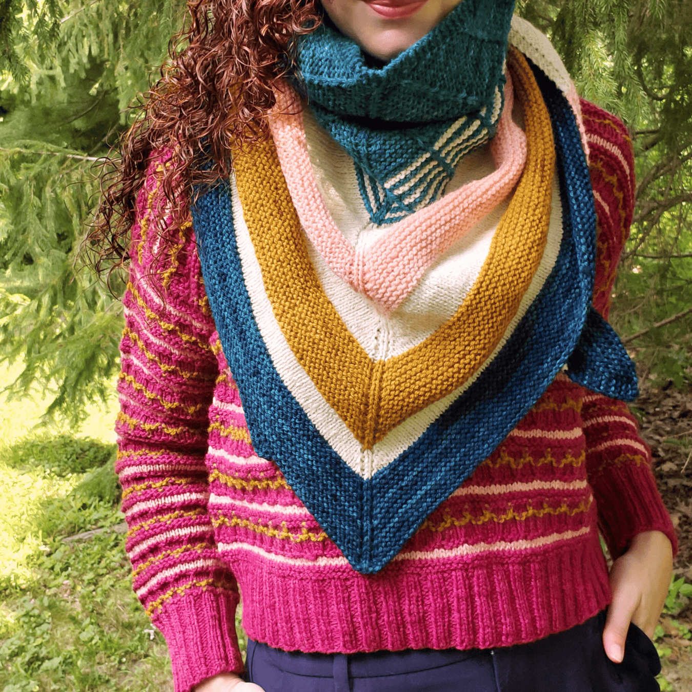 It’s a striking, symmetrical triangle shawl with a soothing rhythm: alternating garter and stockinette stitch sections, a bold slipped-stitch panel, and playful colorwork that radiates into the body. It’s the kind of knit that keeps you engaged from the very first stitch, but still lets you sip your coffee, chat with friends, or watch your favorite show while you work.
