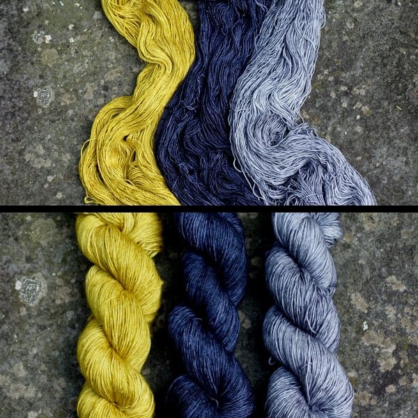 Harvest Moon or Silvery Moon — which way do you want to go for your Ixchel sweater? Harbour Singles in Round Midnight, shown with Turmeric and Silvery Moon. Decisions, decisions.