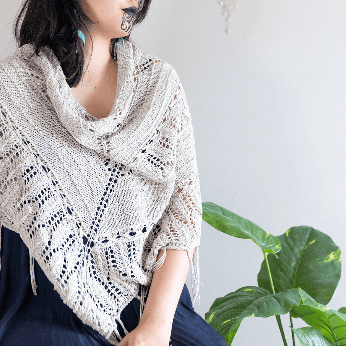 The stitches used in this shawl represent and sometimes mimic traditional weaving techniques. Lace stitches and tassels imitate feathers, a common decoration for traditional Māori cloaks. A special combination of dropped and cable stitches approximates a cabling done in weaving, and you’ll marvel as these stitches come together in your hands.