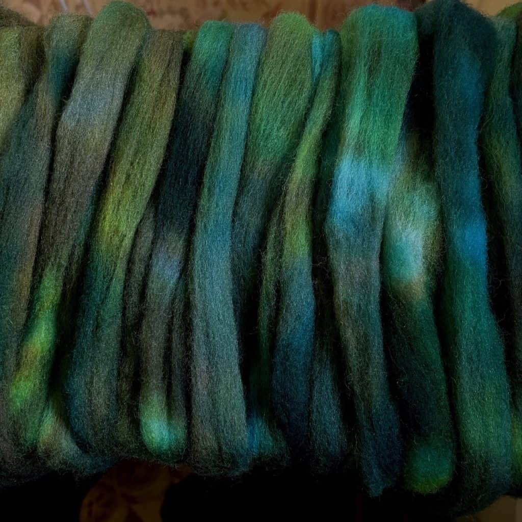 I’m doing something a little different as a fiber dyer. Rather than hand painting, or dropping dry dye powder on my fiber in a dye pot, I’m mimicking some of my favorite variegated yarn colors. I’m immersion dyeing using four to six different custom color formulas, and letting the colors mingle and overlap. When spun up, while they aren’t a direct mirror of my matching yarns, they come surprisingly close. It’s more like the yarns I’ve been dyeing for years, with my emphasis on optical blending, or what I like to call a wall of color, have been a foreshadowing of the spinner I didn’t know I’d become.