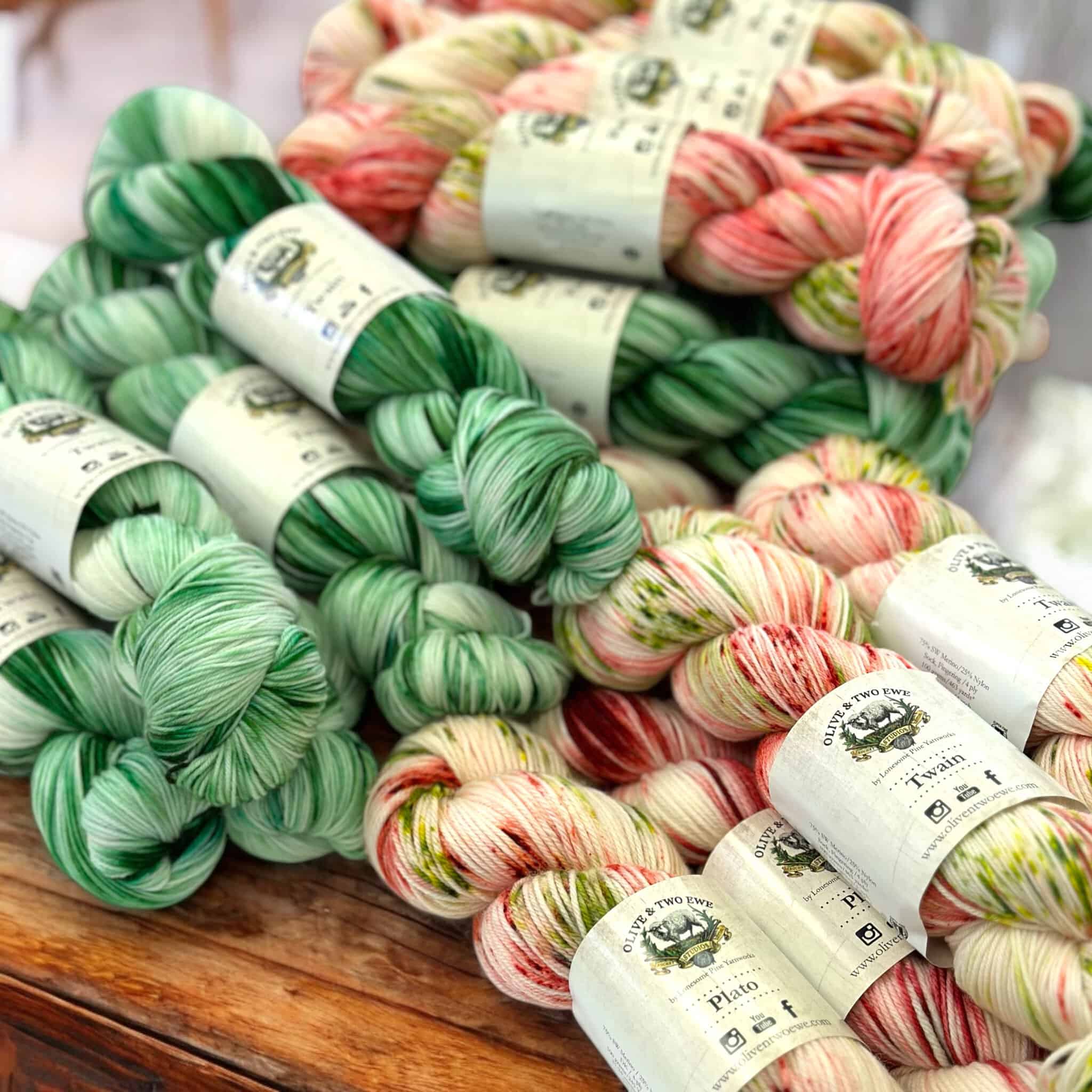 Michelle of Olive & Two Ewe Studios has new Christmas colorways in stock, including Hard Candy Christmas, Run Run Rudolph and Go On Green, available on both fingering and DK.