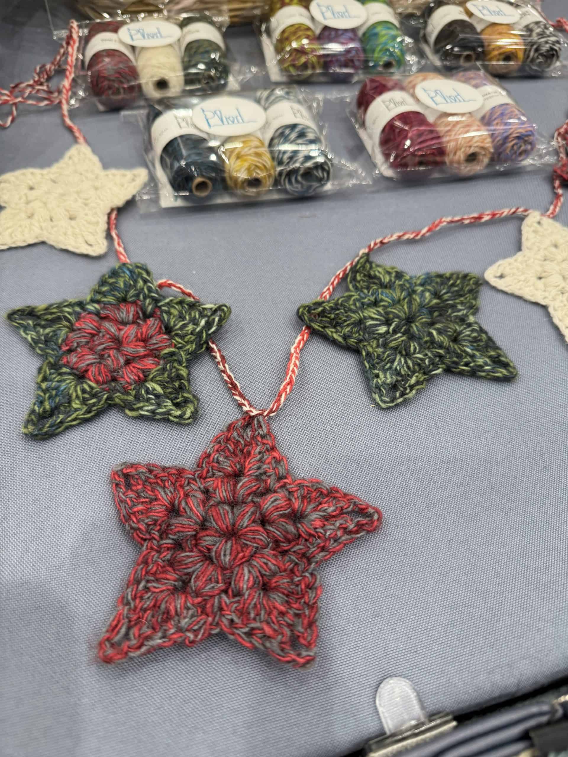 There were so many more crochet samples, from ornaments at the Plied booth to stunning garments that came down the runway at h+h’s first fashion show. It felt like almost every garment sample that caught my eye was crochet. There were even quilts with crocheted edging.
